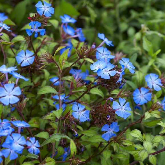 Perenne semi-sempreverde con fiori blu intenso e foglie che diventano rosse in autunno. Ideale per bordure miste o giardini rocciosi, aggiunge colore per tutta la stagione.