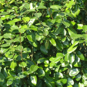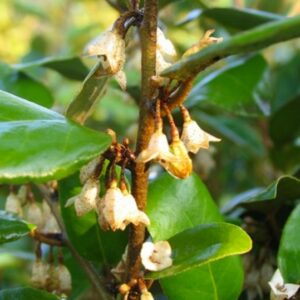 Arbusto sempreverde con foglie argentate, ideale per siepi e bordure. È resistente alla siccità e al vento, e produce piccoli fiori bianchi profumati seguiti da bacche argentate.