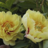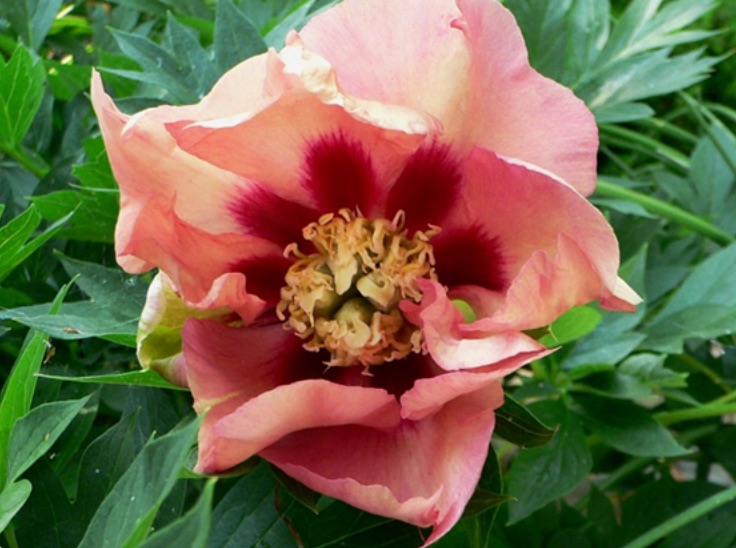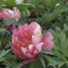 Questa Paeonia ibrida intersezionale ha fiori grandi di color salmone con sfumature rosate e un centro dorato. È una pianta vigorosa, con fogliame verde scuro che mantiene il suo aspetto decorativo anche dopo la fioritura.