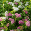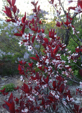 Il Prunus x cistena è un piccolo arbusto con foglie porpora e fiori rosa chiaro. È apprezzato per il suo fogliame decorativo e la sua fioritura primaverile, ideale per bordure e siepi basse.