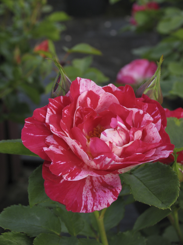 Variante a radice nuda della Rosa Henri Matisse, con gli stessi fiori striati e il portamento compatto, ideale per impianti autunnali o primaverili.