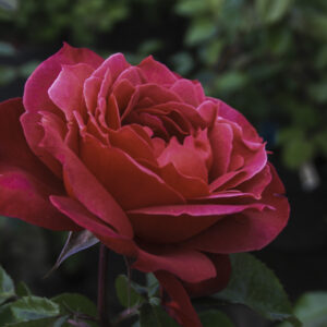 Rosa Floribunda con fiori di medie dimensioni e un colore unico che ricorda il cioccolato. È rifiorente e ha un portamento cespuglioso.