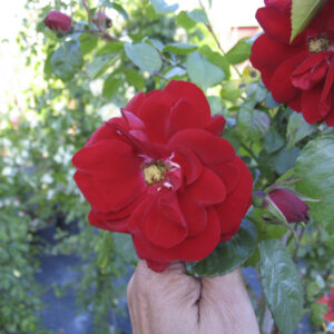 Rosa rampicante con fiori grandi, doppi e leggermente profumati, di colore rosso brillante. È molto rifiorente e resistente alle malattie, perfetta per coprire pergolati, archi e muri.