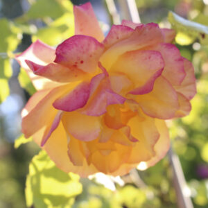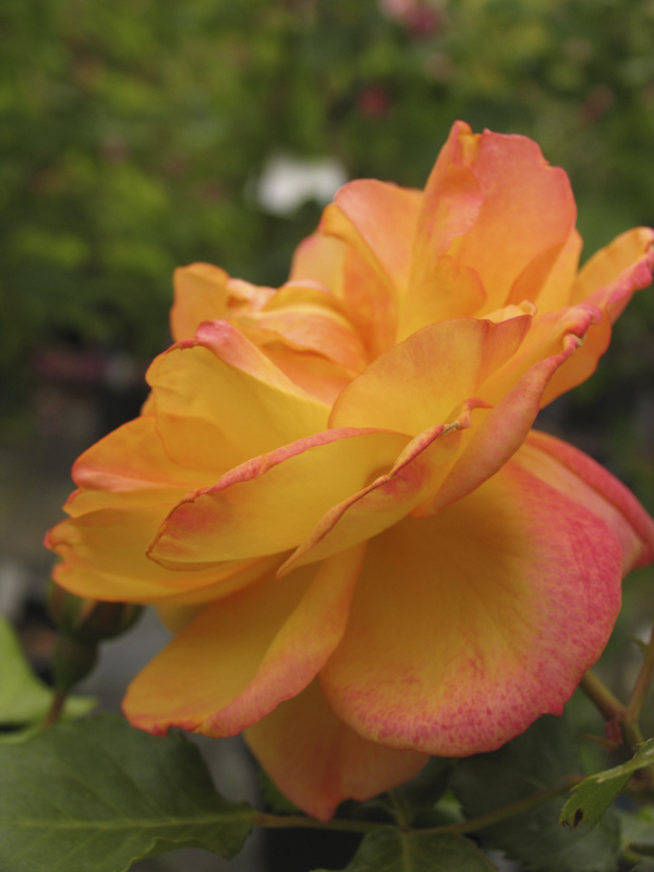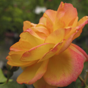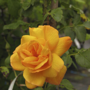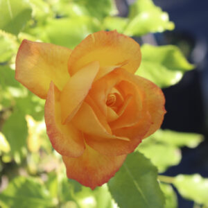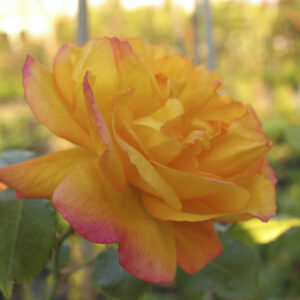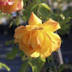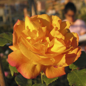Rosa Floribunda con fiori doppi di colore giallo con sfumature aranciate. È molto rifiorente e resistente alle malattie, ideale per bordure e giardini colorati.